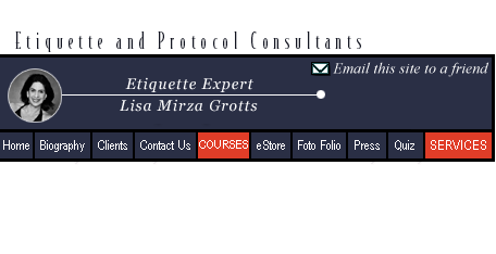 Ring in the Holidays with Style Mind Your Manners The new rules of office etiquette Flag Etiquette Salon Sense Dining Out Etiquette: Rules for Splitting the Check The complicated etiquette of tipping Re-Gift Without Fear Ring in the Holidays With Style The Art of the Receiving Line at Official Functions Workplace Etiquette: Be Your Best at Work Tech Etiquette Q&A Mealtime Common Etiquette Mistakes & Dining What-If's Out and About This Summer Travel Etiquette for Smooth Journeys The Rules of Polite Behavior in the Air: Private Jet Etiquette Summer Camp at Sperry Chalet Glacier National Park, Montana Wine Basics: Drinking, Serving, and Tasting Wines Sushi Etiquette Here Comes the Bride: Wedding Etiquette Table Etiquette: Two Different Styles of Eating Prom Advice for Parents Oprah's Call to Action: No Texting, No Cell Phones, No Kidding! Is There Such a Thing as Hospital Etiquette for Visitors? The Business of Etiquette in the New Millennium: Business and Social Introductions Business Entertaining Over a Meal: Etiquette for Breakfast, Lunch, Afternoon Tea, and Dinner Customer Service Etiquette: How to Keep Your Customers Happy Social Media: The Choice of a New Generation The Perfect Stationery Wardrobe: Business, Social, and Thank-You Notes Minding Other People's Manners: When and How Is It Okay? The Etiquette of Funerals Cocktail Party Conversation: The Etiquette of Small Talk Celebrity Etiquette, American Style! American Flag Protocol: Stars and Stripes Forever Roommate Etiquette: How to Live Together in a Sluggish Economy The Etiquette of Giving: We Get When We Give Bookshelf At Home: Traveler's treasures bring life to flat Holiday tipping can be tricky gift giving Travel Etiquette An Ode to Grace, Civility and Good-Will Good Manners are Good Business Prom Etiquette - Social Graces for Teens - CosmoGIRL! Travel Etiquette Tips from a Local Writer Mayor Johnson's wedding switch draws etiquette criticism E-cards proliferate - but is it OK to send one to Mom?